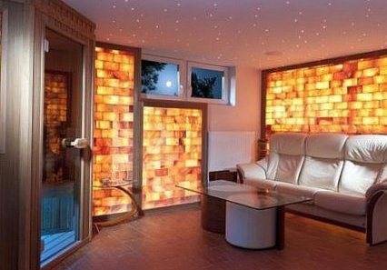 Так как соляные плиты и блоки, а также их установка стоят дорого, часто такими материалами декорируют стены. Если за ними или под ними соорудить подсветку лентами со светодиодами, можно сделать мягкое подсвечивание блоков.