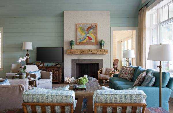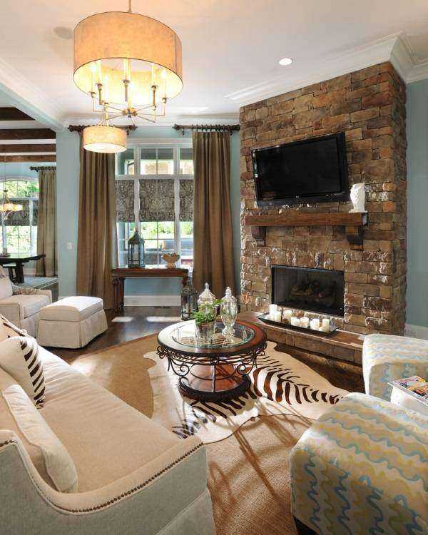 При декорировании гостиной особое внимание следует уделить камину, так как зачастую именно он является наиболее выразительной частью помещения. Так для облицовки камина рекомендуется использовать хотя бы один из цветов, которые уже присутствуют в интерьере комнаты