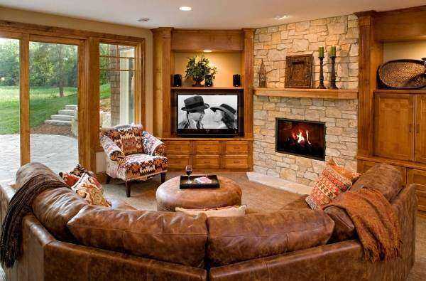 Размещение камина и телевизора на перпендикулярных друг другу стенах – это очень грамотная планировка. В одной комнате имеются два самостоятельных и очень сильных центра общей композиции. В зоне пересечения осей этих центров- диванная группа. Здесь лучше всего работают два дивана, стоящие углом. Один – напротив камина, второй – напротив телевизора.