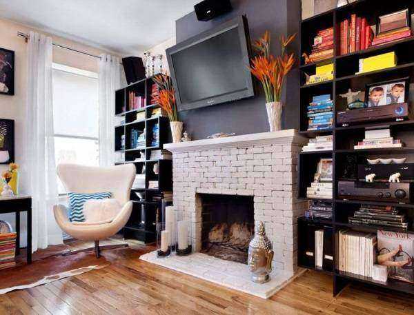 Если не вешать телевизор над камином, то как же тогда разместить? Смотрите на фото: