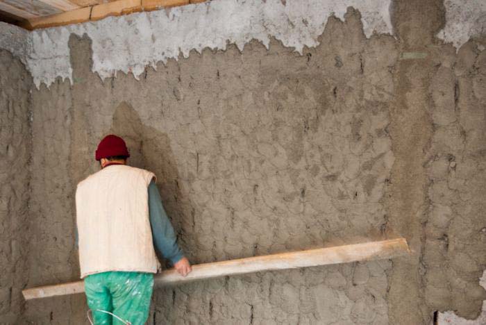 Выравнивание поверхности перед работами производится несколькими методами, но наиболее практичным и дающим стабильные результаты считается метод провешивания. Подлежащую декоративному оштукатуриванию часть стены маркируют по диагонали дюбелями, после чего между ними натягивают, пользуясь отвесом, мерительный шнур. По провесу шнура судят о том, где и каким образом произвести выравнивание стены.