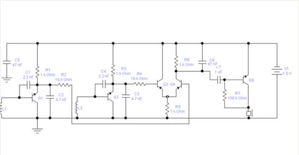 Генератор импульсов собран на микросхеме NE555. Выбирая C1 и 2 и R2 и 3, частота регулируется. Импульсы, полученные в результате сканирования, передаются на транзистор Т1 и передают сигнал на транзистор Т2. Усиление звуковой частоты происходит на транзисторе BC547 на коллектор и подключаются наушники.