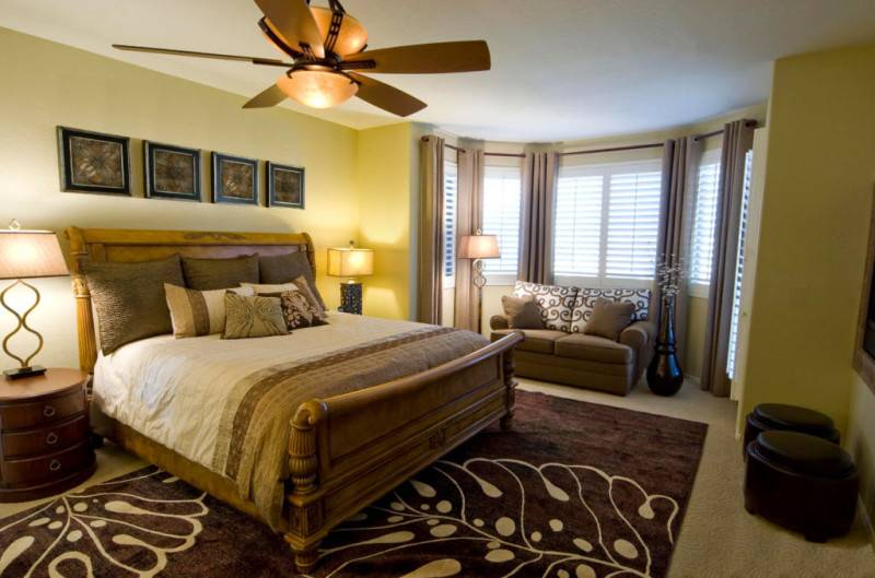 Классическая схема – спальня, оформленная в едином тоне, дополняется ещё одним похожим оттенком на ковре. Главное здесь – не переборщить, выбрать один-два похожих цвета за основные и сторониться резкого контраста (как на тигре, например).
