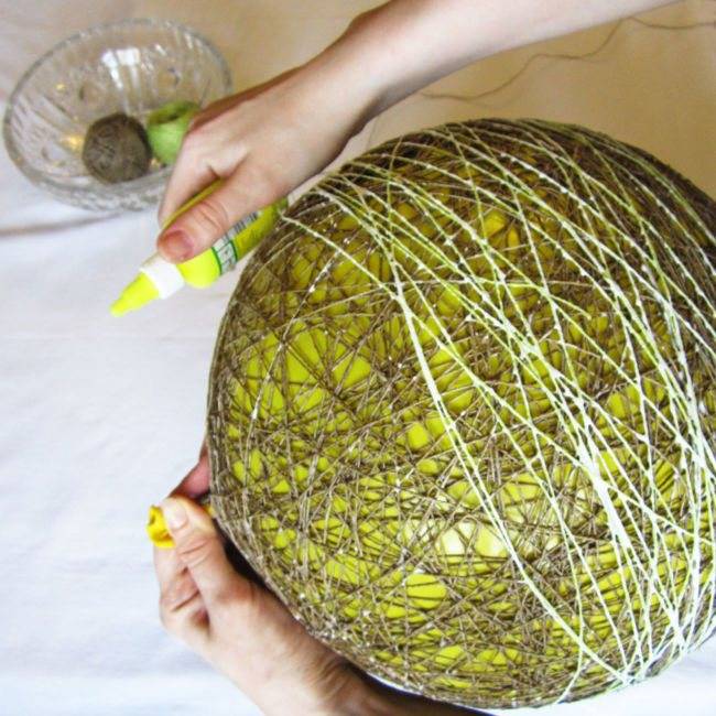 Шаг 4. Когда все нитки будут намотаны, немного пройдитесь клеем по тем местам, где его недостаточно. Теперь абажур почти готов и его следует убрать высыхать на ночь.