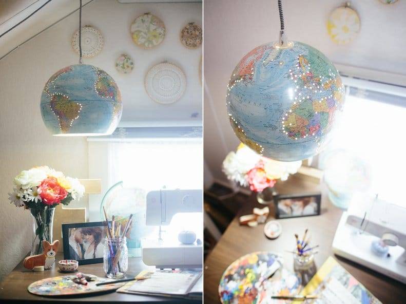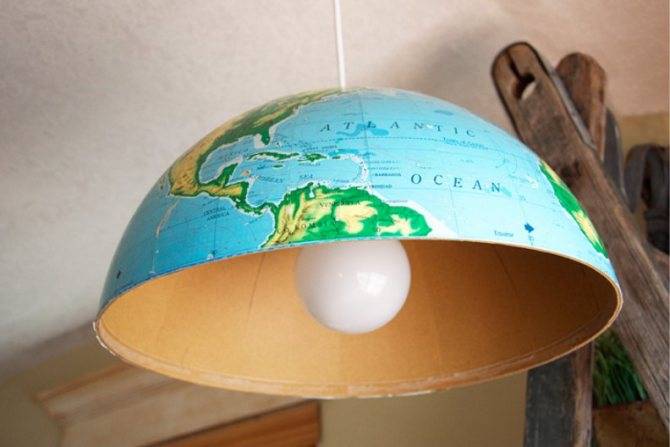 Подвесная люстра из целого глобуса отличается тем, что в конце нужно будет склеить обе половинки вместе. Такой светильник будет давать очень тусклый свет и подойдёт разве что в качестве ночника.