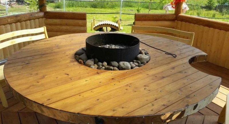 Последний вариант стола в беседку, который мы хотим вам продемонстрировать, имеет необычную форму столешницы. Вместо того, чтобы оставить ее обычной круглой формы, мастер решил подчеркнуть округлость форм, добавив круг в качестве недостающей части столешницы. Делаются подобные операции с помощью электролобзика. Помимо этого в центр столешницы встроен мангал, что мы уже встречали в предыдущих вариантах. Такое решение можно встретить достаточно редко