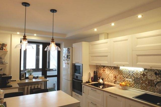 Освещение для двухуровневых потолков на кухне имеет особое значение. И гипсокартонный вариант, и натяжное полотно позволяет закрепить самые разнообразные светильники, причем на любом участке.