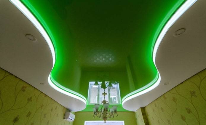 Неоновые оттенки – чаще всего, салатовые, фиолетовые, розовые и другие – равномерное рассеивание светового потока от люминесцентного газа позволяет создать эффект парящего потолка, выделить функциональные зоны в помещении, добавить комнате таинственности и подчеркнуть отменный вкус хозяина. Нередко такое освещение включается в момент проведения торжественных мероприятий, часто устраивается в дискоклубах, барах или ресторанах.