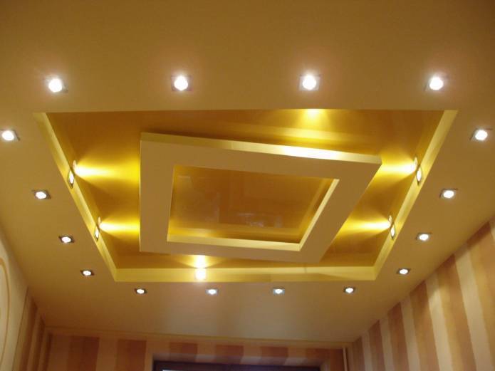 Иначе обстоит дело в больших комнатах, площадь которых более 20 кв. м. Многие желают сделать в них неповторимый дизайн с помощью многоярусных потолков с подсветкой. Для просторных помещений можно смонтировать каркас из гипсокартона в 2 – 3 яруса, снабдить его боковым скрытым освещением или встроенными галогенными, светодиодными, люминесцентными лампами.