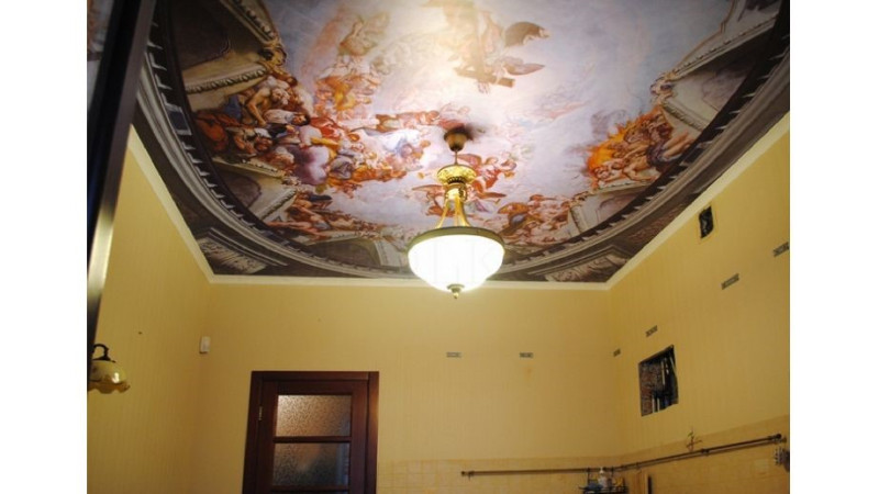 Оригинальный фотопринт на натяжном потолке выигрывает своей долговечностью и быстротой исполнения по сравнению с настоящей росписью.