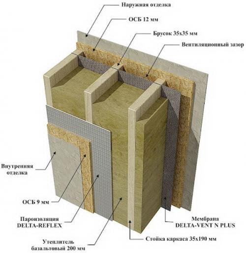 Каркасные стены представляют собой «скелет» из деревянного бруса или доски либо из металлического профиля. Утеплитель в этом случае укладывается между элементами каркаса. Такие стены у деревянных канадских и финских домов, фахверка, всех быстровозводимых зданий.