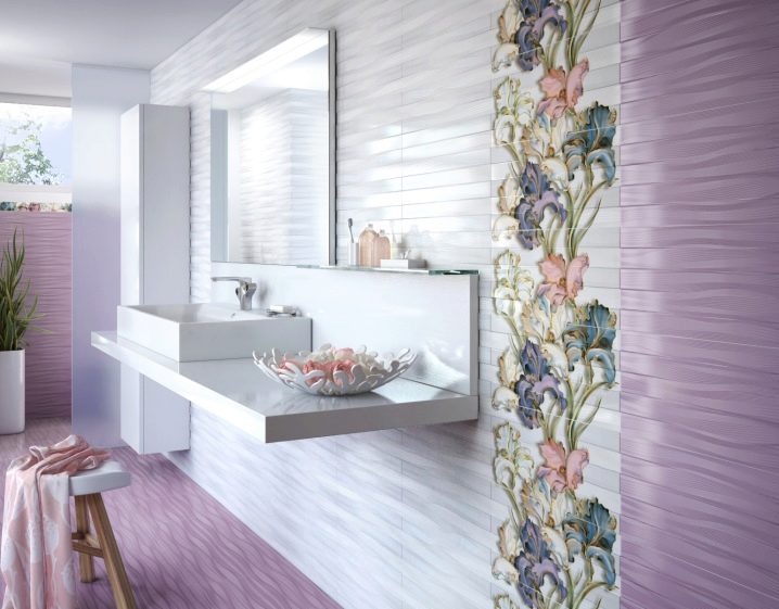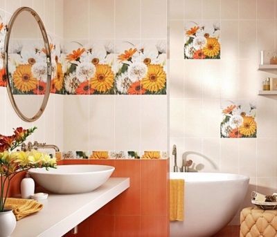 Великолепное сочетание плитки белого и кораллового цветов из коллекции Plesire эффектно дополняют декоративная плитка и широкий бордюр с радующими глаз полевыми цветами.