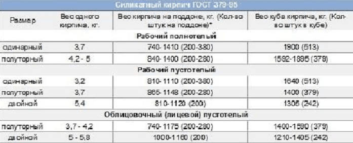 Весит силикатный блок немало. От того, сколько конкретно весит тысяча штук или куб камня, зависят ваши транспортные расходы. В справочнике куб полнотелого силикатного кирпича весит от 1700 до 1900 кг. Такой силикатный кирпич весит 3,7-3,8 кг.