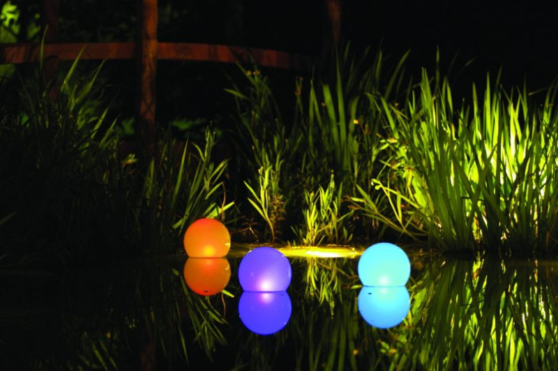 , светильники «Камень». Также работают на солнечных батареях. Помимо реалистичной имитации под камень, характеризуются демократичной стоимостью. Используются для подсветки пруда на берегу, пригодны и для организации освещения под водой. - Плавающая подсветка фирмы Aquael.