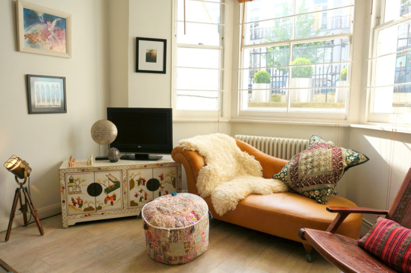 Здесь можно сочетать мебель разных цветов и стилей. Массивную мебель и технику обычно ставят у стены, а маленькую – ближе к центру. Таким образом, они уравниваются в размере: большой предмет стоит дальше, в то время, как маленький – ближе. Один из самых сложных вопросов в данном случае – правильно выбрать точку обзора. Обычно выбирают места отдыха (мягкая зона гостиной, кровать в спальне, обеденный стол на кухне), где люди часто проводят время.