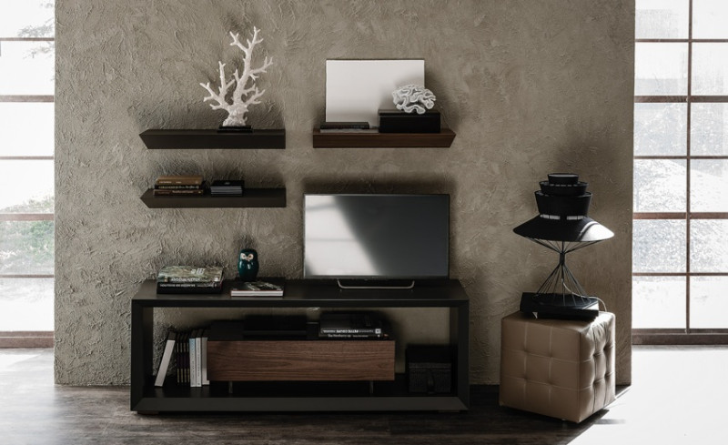 - возможность размещения дополнительных аксессуаров. В современном оформлении интерьеров существует тенденция к применению минимального количества элементов мебельного гарнитура, за счет их функциональности, когда один предмет мебели может заменять два или три. В наше время, производитель старается всячески воплощать эту идею, благодаря чему, тумба под телевизор в современном стиле может иметь дополнительные ниши, полочки или отверстия для размещения необходимых аксессуаров и хранения вещей;