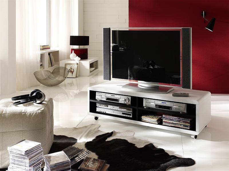 Слишком выделяющаяся по стилю или материалу деталь способна привлечь лишнее внимание, неверно расставить акценты в комнате. Идеальный вариант – это подобранная по цвету к основной мебели тумба, выдержанная в общем стилевом решении помещения. Крайне редко для создания яркого цветового пятна дизайнеры используют именно этот предмет мебели, ведь тумба должна быть максимально нейтральной, чтобы не отвлекать внимание от происходящего на экране