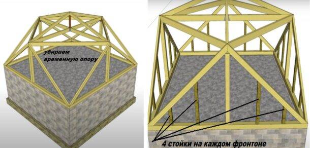 - Временную опору на данном этапе, после надежного закрепления всех несущих элементов, можно убирать. Хотя в оригинальной конструкции Судейкина такая опора оставалась на месте, но современные крепежные технологии позволили уйти от этого, тем самым освободив дополнительное пространство на чердаке.