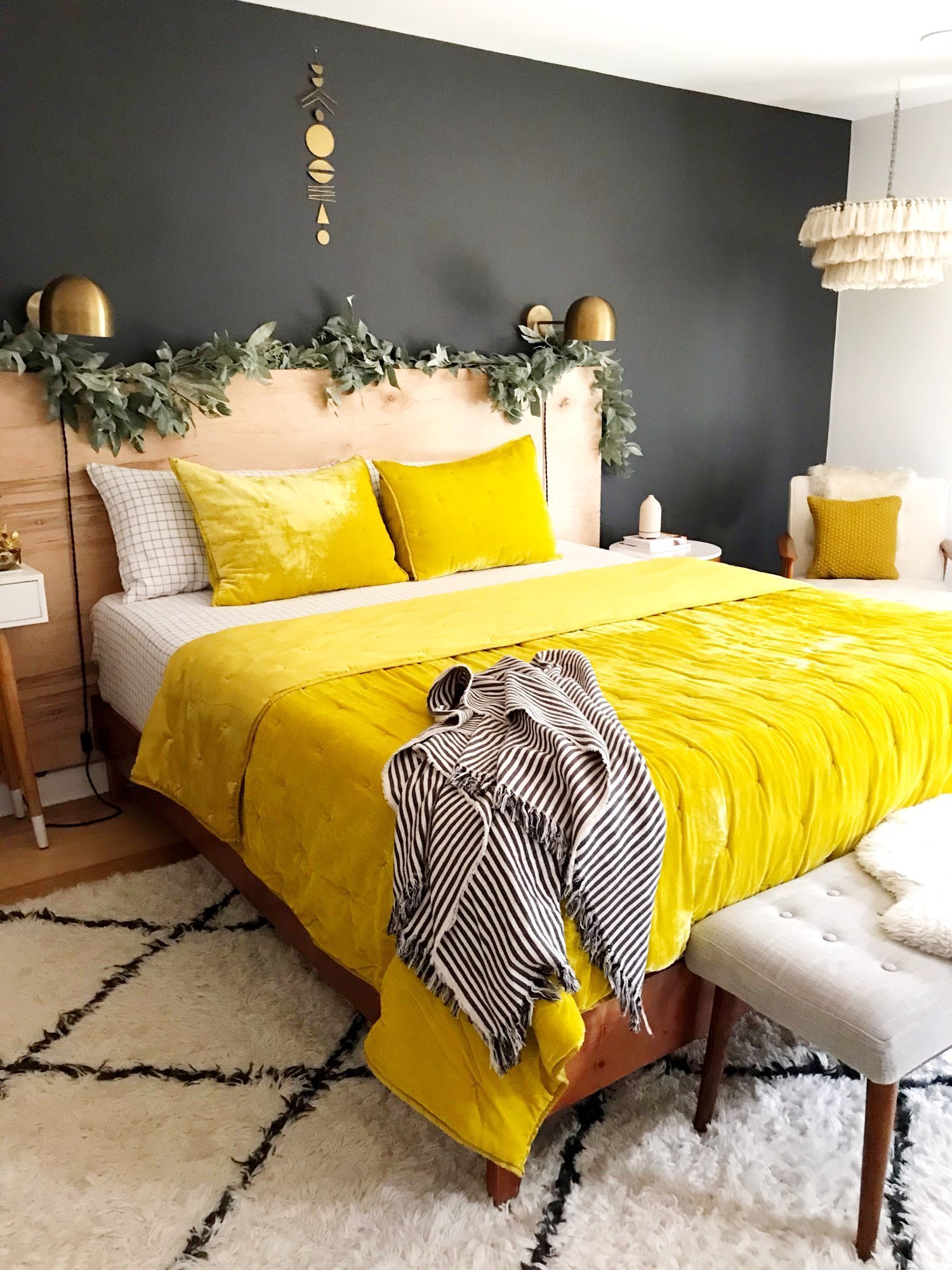 Желтая мебель и шторы в светлой спальнеИсточник pinterest.co.uk
